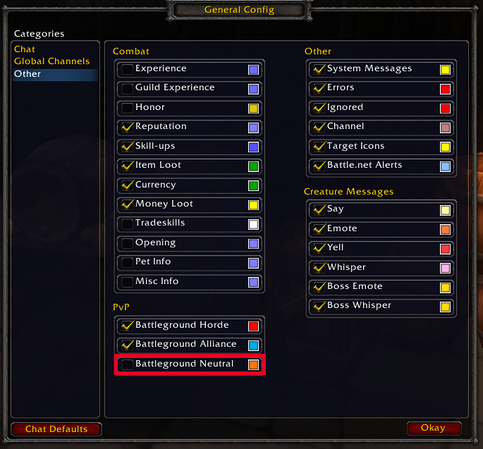 For those who are not interested in seeing messages like this, you can disable all pvp announcements in chat settings. To access them, right click the General chat tab, and click on Settings.