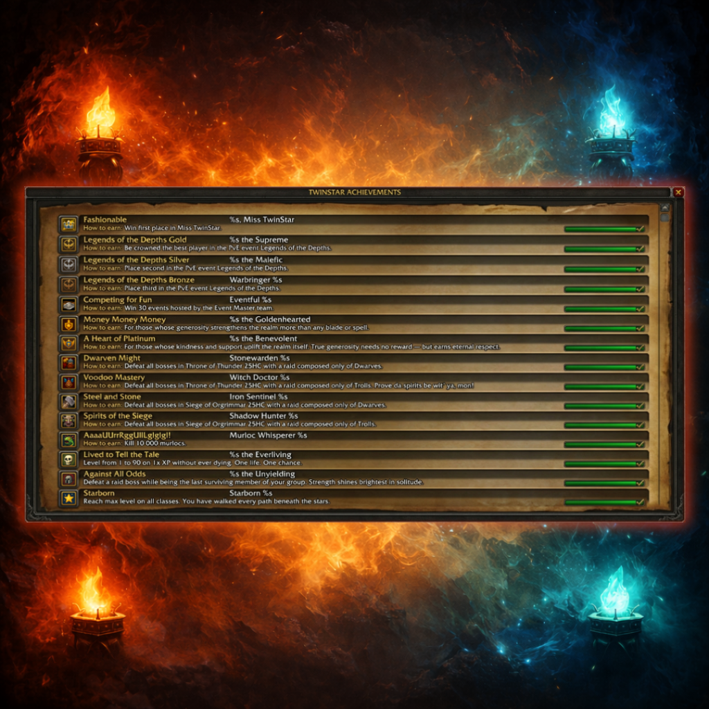 Dear players, as promised, here comes the second daily announcement on the road to our big Xmas event starting this Wednesday, 17.12.2025. Today is all about something we’re extremely excited about: Brand new, fully custom achievements and titles – made just for TwinStar.